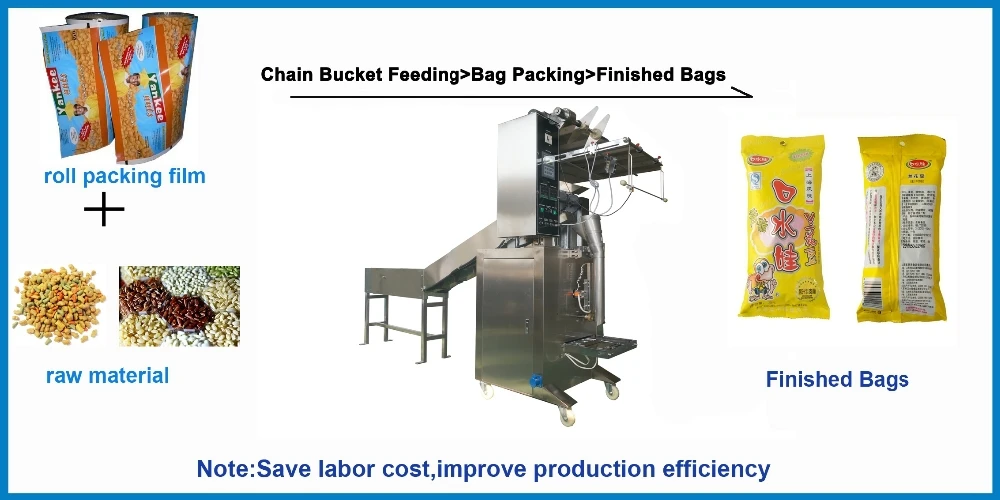 Chain Bucket Almond Cashew Nut Apricot Packaging Machine is Suitable for automatic packing flowable or non-flowable granule products and special shape big granule,including food, pharmaceutical, seeds, such as granular beverage, coffee, salt, sugar, melon seeds, rice, oatmeal, tea in bulk, monosodium glutamate, desiccant, washing powder, and also noodles,etc.
