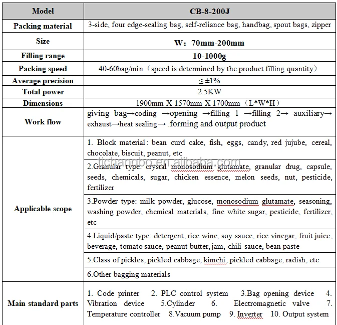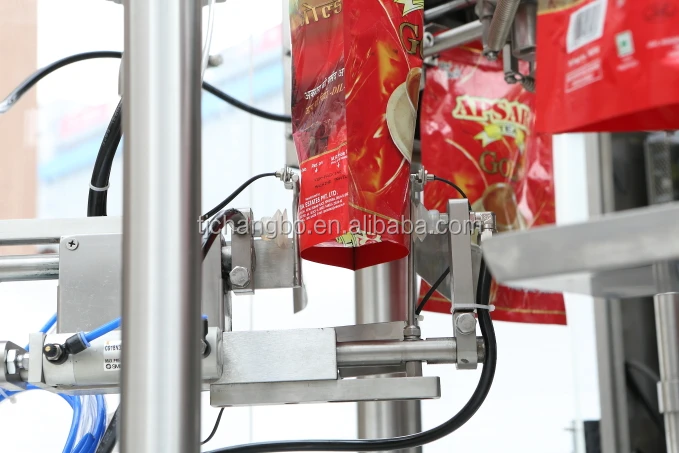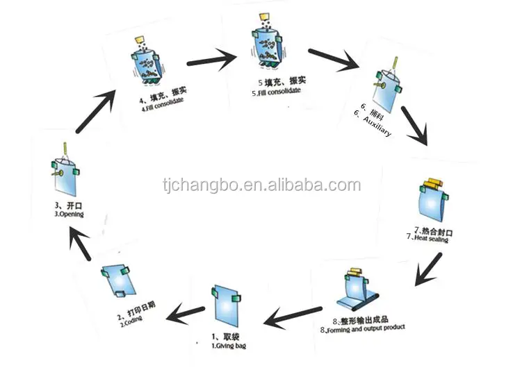 Bag given packaging machine replaces of manual packing type,which helps large enterprises,small and medium-sized enterprises reach to packaging automation,equipment mechanical grip will automatically take bag,print date,open the bag,to the metering device signal measurement and blanking,sealing,output.Main optional configuration for measuring material filling machine working platform,weight,scale,material hoist,vibrating feeder,finished goods transport hoisting machine,metal detection machine,etc.It adopts Japan's latest technology,under the total control system of PLC + POD,adopt mechanical structure,operation gradually replaced the operation of the pneumatic structure, to form a greater demands of the processing technology,easy operation,stable operation,maintenance,easy to clean,beautiful appearance.